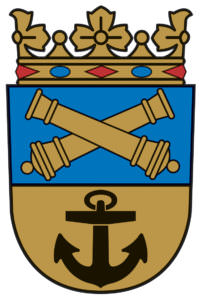 Vaakunan selite on sini-kultakatkoinen kilpi. Sinisessä kentässä on kaksi kultaista tykkiä ristikkäin ja kultaisessa kentässä musta ankkuri.